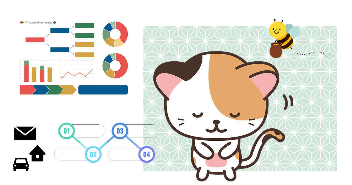 説明画像は文章の内容を分かりやすく補足するためのものになるのでオリジナルなければ行けない場合が多いです。また、プレゼン資料を専門に扱っている方もいるようです。フリー素材サイトを見てみるとフローチャートのひな形のようなものがあります。うまくはまればそういったものを利用するのも良いのではないかと思います。表やグラフを作る場合は、表計算ソフトを使うのが良いと思いますが、デザイン性の高い表を作る場合はアドビのillustratorya、Photoshop、もしくはCanvaで作ると良いと思います。相場としては、簡単なグラフや表の場合3000円~1万円位、プレゼン資料5枚程度で2~10万、高度なデザインや技術を用いた画像になると1点あたり、1万から5万位、企業向けの本格的なプレゼン資料の場合は10万から50万円位(20枚~50枚以上)といった感じです。いずれも依頼先や枚数、デザインによってかわります。あくまでも目安として考えていただきたいと思います。 - 背景パターン