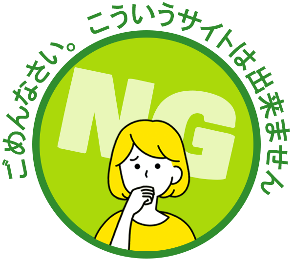 販売サイト、厳重なセキュリティーを必要とするサイト、高度なプログラムスキルが必要となるサイト、その他トラブルにより閲覧できなくなることで売り上げに大きな損失をもたらすサイトは、制作後のサポートが困難なためお断りしています。受注を受ける前のミーテイングにてサポートの範囲をお話します。また、「こんなサイトを作りたいんだけどできますか?」というお問い合わせに関してはコンタクトフォームより受け付けていますのでお気軽にご連絡ください。