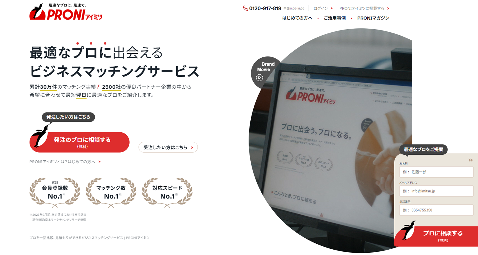• 電話又は問い合わせフォームより問い合わせたら、PRONIコンシェルジュが電話又はメールでヒアリング、その後、受注企業を紹介してもらい、商談、発注先を決定するという流れ。