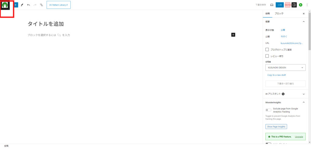 新規投稿画面に入ったら、まず投稿ページの設定を行います。画面の右側をご覧ください。ここで投稿画面の設定を行います。右側に何も表示されないという方は右上のアイコンを(赤い矢印のところ)クリックすると設定項目が表示されます。