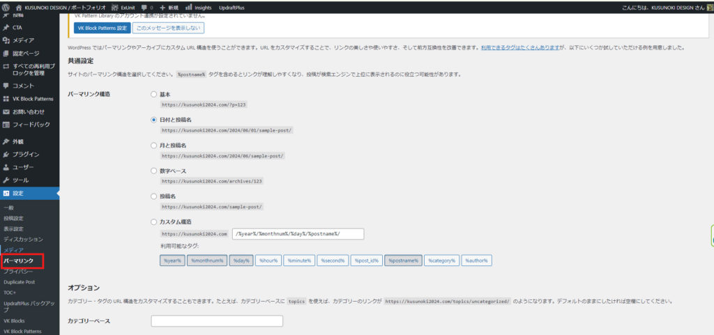 このページを表示させるには管理画面の横の黒い部分で設定と書いてあるところにカーソルを近づけ、さらに項目が表示されたら、その中からパーマリンクをクリックします。するとこちらの画面に移動します。こちらの画面ではパーマリンクの構造のパターンが6つ表示されています。このうち一つを選択するとパーマリンクの基本構造が登録さます。例えば日付と投稿名というものを選ぶとドメインの後の西暦・月・日にちは自動で設定され最後の投稿名の部分だけ投稿の編集画面で設定することになります。投稿名は、その記事をイメージしやすい言葉をアルファベットや数字で登録することをオススメします。何も登録しないとページタイトルがそのままパーマリンクとなります。それでもページは表示されますがあまりお勧めできません。なぜかというと日本語のURLになってしまうからです。日本語のURLは、メールなどにコピペするといろいろな記号が並んだ長い文字列に変換されてしまい、見た目上あまりよくありません。それを見た人もいい印象は持たないのではないかと思います。動画では実際に日本語のURLの文字列をワードに貼り付けていますがとても長いURLになってしまう事がご理解いただけると思います。それとパーマリンクの設定には重要な注意点があります。それは、一度設定したパーマリンクの構造ですが、決して後から変更してはいけないという事です。投稿をして暫く時間がたつといろいろなところでこのページのリンクが貼られることになると思います。その後でパーマリンクのを変更してしまうとURLが変わってしまい、リンクをクリックしても目的のページが表示されないという事になってしまいます。それにより、アクセス数の低下や検索エンジンからの評価が下がるなどの深刻な問題が発生します。ですのでパーマリンクは最初にしっかり考えてから設定しその後は絶対に変更しないようにしましょう。