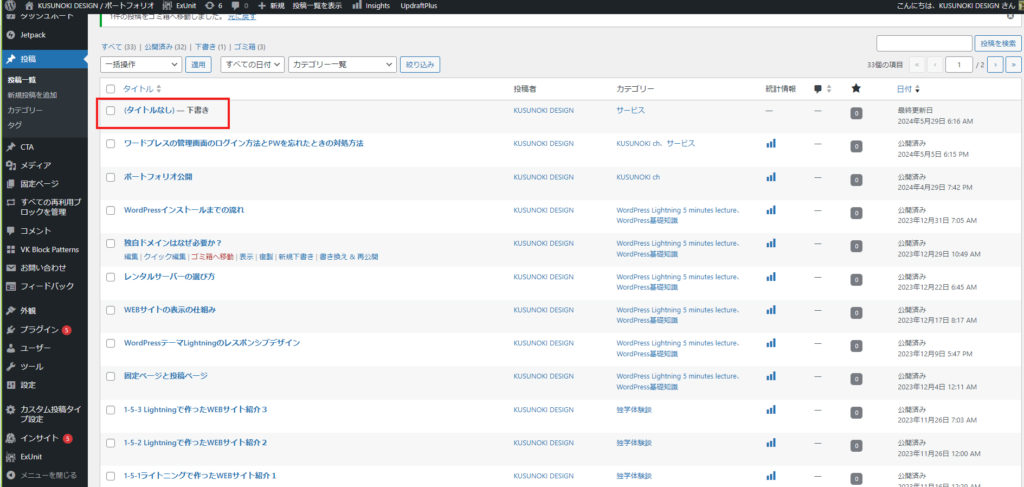 投稿一覧を見ると今まで投稿した記事の一覧が全て表示されます。また、編集したい時は編集したい記事をクリックすると編集画面に飛ぶことが出来ます。それと赤枠の部分ですが、下書きと書いてありますが、これは、まだ公開せずに下書き保存されている記事となります。こちらも、クリックすることで編集画面に飛ぶことが出来ます。