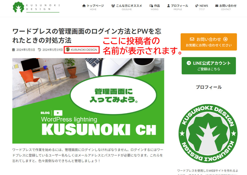 ②は、投稿者の設定をする場所です。下の画像は、私のブログですが、赤い四角で囲った部分に投稿者の名前が表示されます。投稿者は複数登録できます。投稿者の設定するところの下矢印をクリックすると他の投稿者のリストが表示されますので、そちらで切り替えることができます。ただしそれには投稿者を登録しておく必要があります。今回は複数の登録はしていないので一つの登録者名しか出てきません。