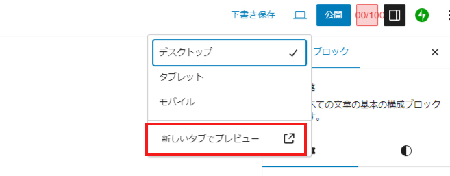 作業中、途中で時間がなくなってしまう事はよくあると思いますがそんな時は下書き保存をします。下書き保存をして画面を閉じれば、作業を再開する時は、その時点から続けることが出来ます。また、プレビューを見たいときは、⑪のアイコンをクリックし、新しいタブでプレビューをクリックするとその時点の状態がプレビューされます。