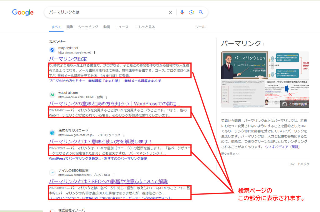 パーマリンクとは、WEBページごとに設定したURLの事です。今回の場合は、以下の画像の黄色い部分がパーマリンクになります。